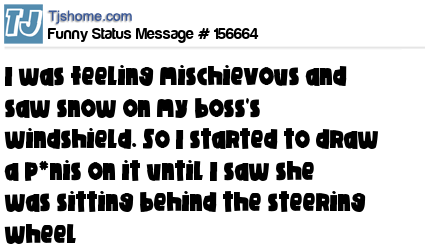 X says I was feeling mischievous and saw snow on my boss's windshield. So I started to draw a p*nis on it until I saw she was sitting behind the steering wheel