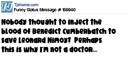 X says Nobody thought to inject the blood of Benedict Cumberbatch to save Leonard Nimoy?  Perhaps this is why I'm not a doctor...