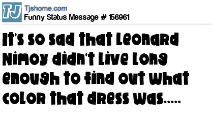 - # 156960 Dear Leonard Nimoy. As much as I hate to see you go, thanks for upstaging that stupid "Dress Color Controversy" thing on Facebook. It's black and blue, by the way.