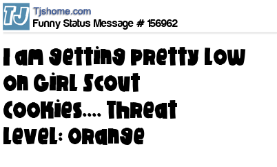 X says I am getting pretty low on Girl Scout Cookies.... Threat Level: Orange