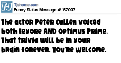 X says The actor Peter Cullen voiced both Eeyore AND Optimus Prime. That trivia will be in your brain forever. You're welcome.
