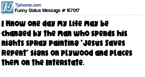 X says I know one day my life may be changed by the man who spends his nights spray painting "Jesus Saves Repent" signs on plywood and places them on the Interstate.