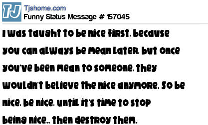 X I was taught to be nice first, because you can always be mean later, but once you've been mean to someone, they wouldn't believe the nice anymore. So be nice, be nice, until it's time to stop being nice.. then destroy them.
