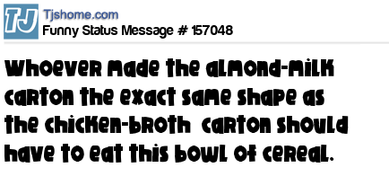 X says Whoever made the almond-milk carton the exact same shape as the chicken-broth carton should have to eat this bowl of cereal.