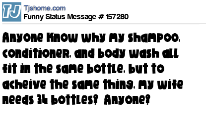 X says Anyone know why my shampoo, conditioner, and body wash all fit in the same bottle, but to acheive the same thing, my wife needs 34 bottles? Anyone?