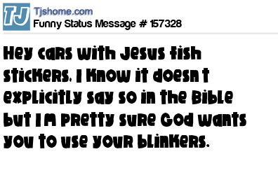 X says Hey cars with Jesus fish stickers, I know it doesn’t explicitly say so in the Bible but I’m pretty sure God wants you to use your blinkers.