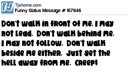 - # 166203 Don't walk behind me, for I may not lead. Do not walk ahead me, for I may not follow. Do not walk beside me either. Just pretty much leave me the hell alone.