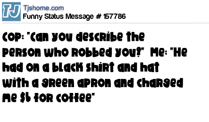 - # 159571 Cop: "Can you describe the person who robbed you?".. Me: "He had on a black shirt and hat with a green apron and said it would be $6 for coffee"