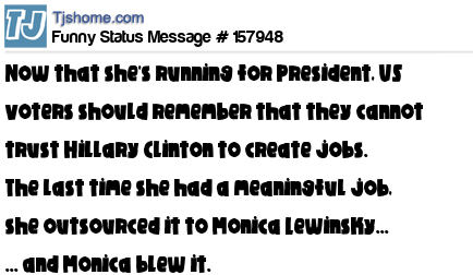 X says Now that she's running for President, US voters should remember that they cannot trust Hillary Clinton to create jobs. The last time she had a meaningful job, she outsourced it to Monica Lewinsky... ... and Monica blew it.