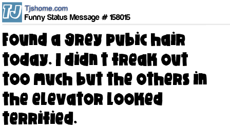 - # 18902 i realized I was getting old today when I discovered my first grey pubic hair."Dont worry, I wasnt as freeked out as the rest of the people in the elivator", I got over it...