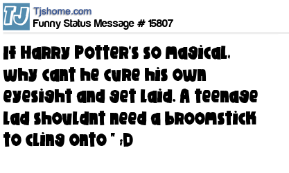 X is If Harry Potter's so magical, why cant he cure his own eyesight and get laid. A teenage lad shouldnt need a broomstick to cling onto " ;D