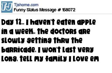 X Day 12.. I haven't eaten apple in a week,, the doctors are slowly getting thru the barricade, I won't last very long, tell my family I love em