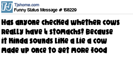 - # 188781 I read this article earlier..that said.."cows have four stomachs"...and I wondered if anyone had checked this?..because it sounds like the sort of thing a cow would come out with to get more food?