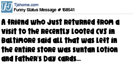 X A friend who just returned from a visit to the recently looted CVS in Baltimore said all that was left in the entire store was suntan lotion and Father's Day cards...