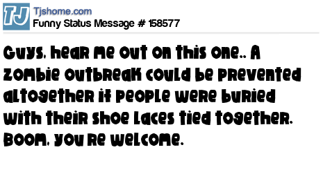 X says Guys, hear me out on this one.. A zombie outbreak could be prevented altogether if people were buried with their shoe laces tied together. Boom, you’re welcome.