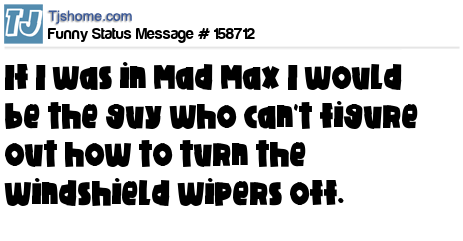 X says If I was in Mad Max I would be the guy who can't figure out how to turn the windshield wipers off.