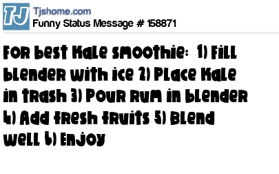 X says For best kale smoothie: 1) Fill blender with ice 2) Place kale in trash 3) Pour rum in blender 4) Add fresh fruits 5) Blend well 6) Enjoy