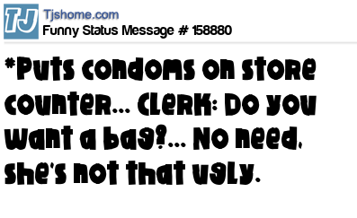 - # 119398 i just bought condoms, and when the cashier asked me if I needed a bag I jus said "No,... shes not that ugly!".