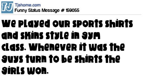 X says We played our sports shirts and skins style in gym class. Whenever it was the guys turn to be shirts the girls won.