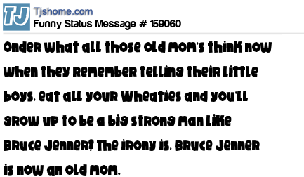 X says onder what all those old mom's think now when they remember telling their little boys, eat all your Wheaties and you'll grow up to be a big strong man like Bruce Jenner? The irony is, Bruce Jenner is now an old mom.
