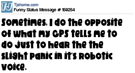 X says Sometimes, I do the opposite of what my GPS tells me to do just to hear the the slight panic in it's robotic voice.