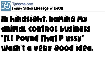 X says In hindsight, naming my animal control business "I'll Pound That P ussy" wasn't a very good idea.