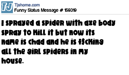 X says I sprayed a spider with axe body spray to kill it but now its name is chad and he is f$cking all the girl spiders in my house.