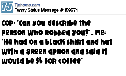 - # 157786 Cop: "Can you describe the person who robbed you?" Me: "He had on a black shirt and hat with a green apron and charged me $6 for coffee"