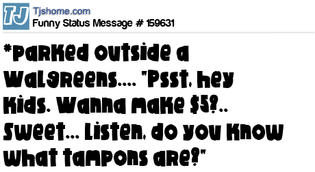 X *parked outside a Walgreens.... "Psst, hey kids. Wanna make $5?.. Sweet... Listen, do you know what tampons are?"