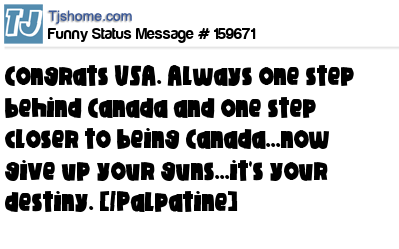 X Congrats USA. Always one step behind Canada and one step closer to being Canada...now give up your guns...it's your destiny. [/Palpatine]