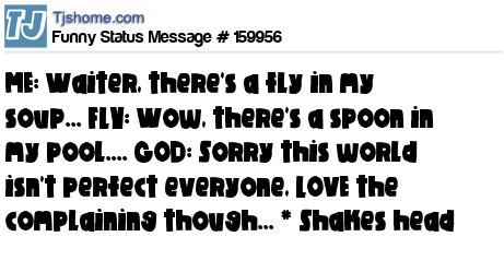 X ME: Waiter, there's a fly in my soup... FLY: Wow, there's a spoon in my pool.... GOD: Sorry this world isn't perfect everyone, LOVE the complaining though... * Shakes head