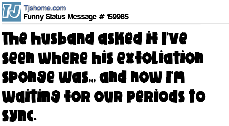 X The husband asked if I've seen where his exfoliation sponge was,,, and now I'm waiting for our periods to sync.