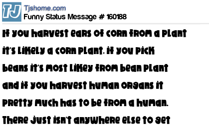 X says If you harvest ears of corn from a plant it's likely a corn plant, if you pick beans it's most likey from bean plant and if you harvest human organs it pretty much has to be from a human. There just isn't anywhere else to get them.