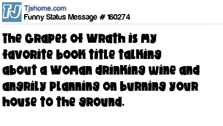 X says The Grapes of Wrath is my favorite book title talking about a Woman drinking wine and angrily planning on burning your house to the ground.