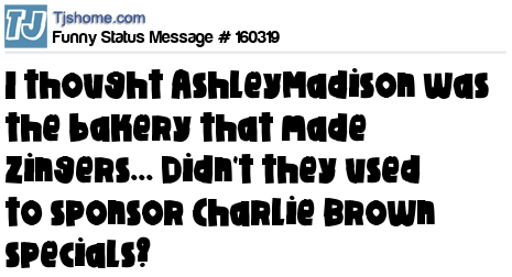 X I thought AshleyMadison was the bakery that made Zingers... Didn't they used to sponsor Charlie Brown specials?