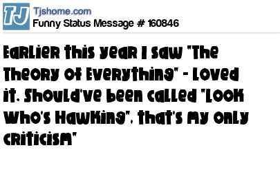 X says Earlier this year I saw "The Theory of Everything" - loved it. Should've been called "Look Who's Hawking", that's my only criticism"