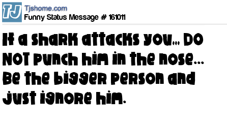 - # 182347 I once told my friend I was attacked by a shark. He said, "Did you punch it on the nose?" I said, "No, it just attacked me for no reason."