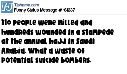 X says 310 people were killed and hundreds wounded in a stampede at the annual hajj in Saudi Arabia. What a waste of potential suicide bombers.
