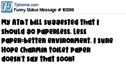 X says My AT&T bill suggested that I should go paperless. Less paper=better environment. I sure Hope Charmin toilet paper doesn't say that soon!