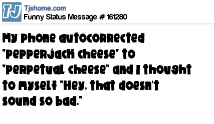 X My phone autocorrected "pepperjack cheese" to "perpetual cheese" and I thought to myself "Hey, that doesn't sound so bad."