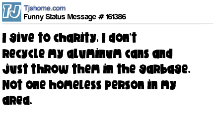 X says I give to charity, I don't recycle my aluminum cans and just throw them in the garbage. Not one homeless person in my area.