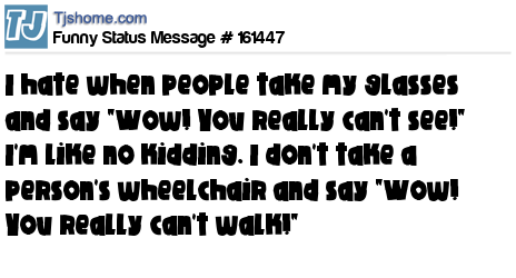 - # 56373 I hate when people take my glasses, put them on, and say, "Oh. You really can't see, huh?" NO s**t sherlock. You don't see other people taking other people's wheel chairs saying, "Oh. You really can't walk, huh?"