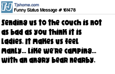 - # 208911 You women may be surprised to learn that making us sleep on the couch really isn't that bad. It's kind of manly, makes us feel like we are out camping... with a really angry bear nearby.