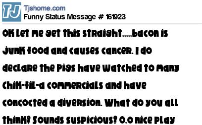 X says Ok let me get this straight.....bacon is junk food and causes cancer. I do declare the Pigs have watched to many Chik-fil-a commercials and have concocted a diversion. What do you all think? Sounds suspicious? O.o nice play piggy nice play!
