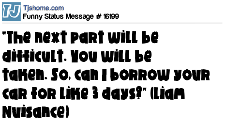 X is "The next part will be difficult. You will be taken. So, can I borrow your car for like 3 days?" (Liam Nuisance)