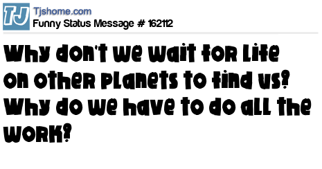- # 24853 Why do we spend so much time looking for intelligent life on other planets? I'd be happy to find intelligent life here on Earth first.