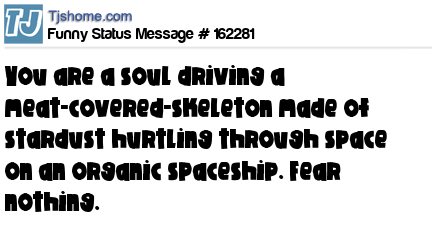 X says You are a soul driving a meat-covered-skeleton made of stardust hurtling through space on an organic spaceship. Fear nothing.