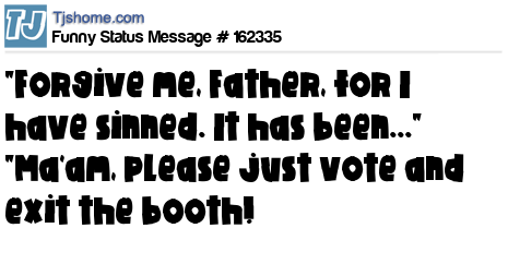 X says "Forgive me, Father, for I have sinned. It has been..." "Ma'am, please just vote and exit the booth!