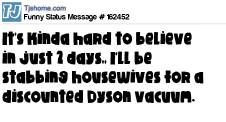 X says It's kinda hard to believe in just 2 days,, I'll be stabbing housewives for a discounted Dyson vacuum.