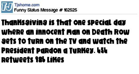X says Thanksgiving is that one special day where an innocent man on Death Row gets to turn on the TV and watch the President pardon a Turkey. 454 retweets 986 likes
